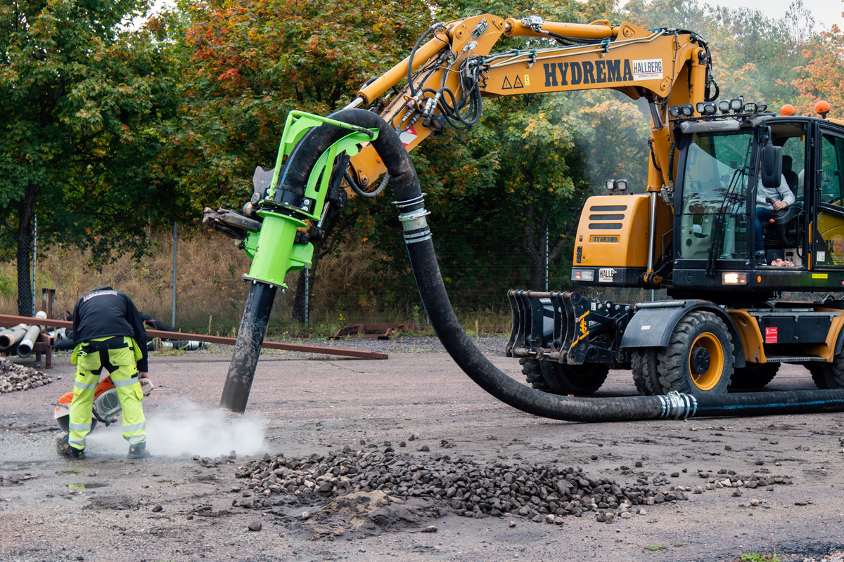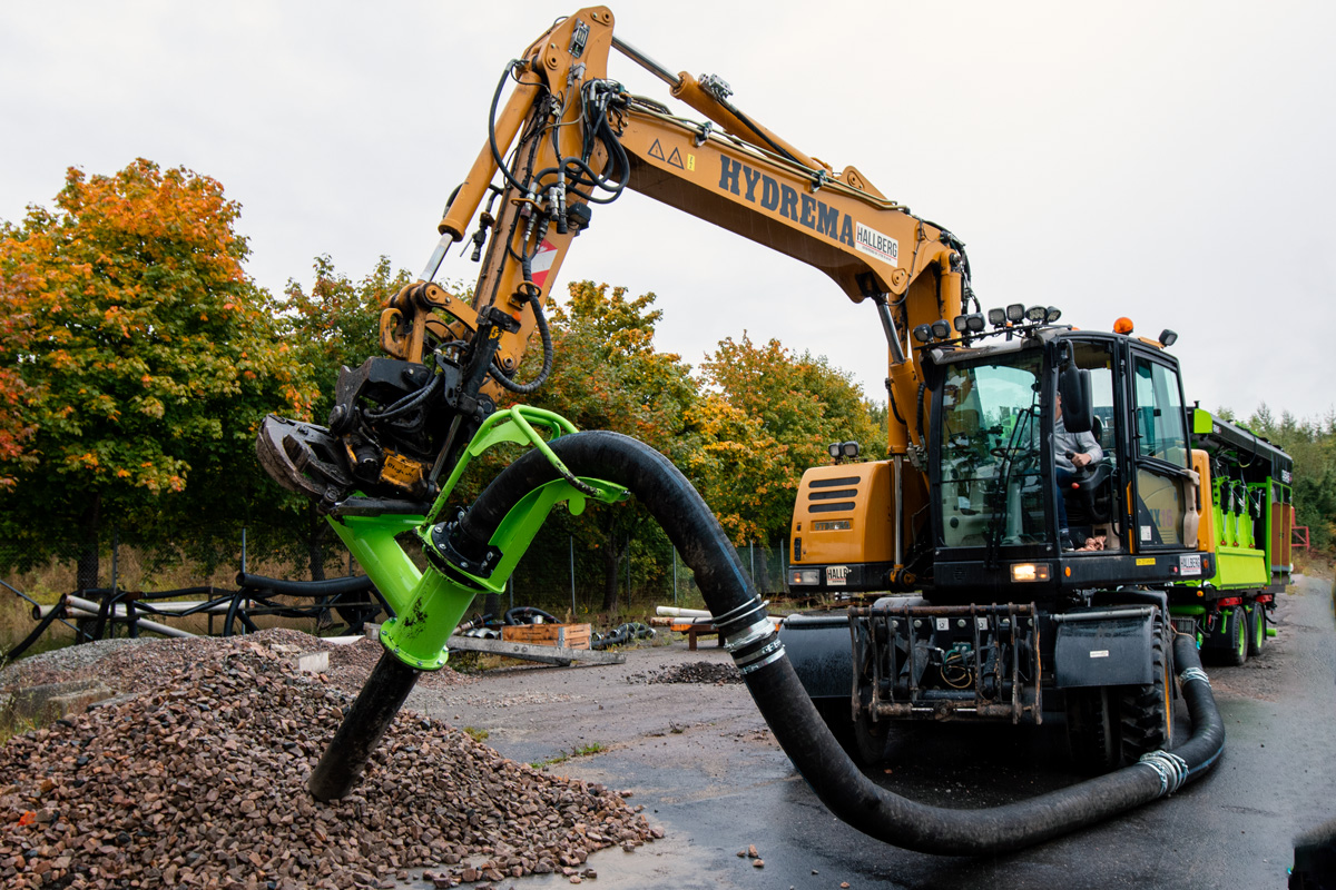 Vacuum suction and hose are operated smoothly and with great precision from the excavator cab. Material is sucked via a 200 mm hose into the material chamber. Use the radio transmitter to activate hydraulic side tipping and drain material.