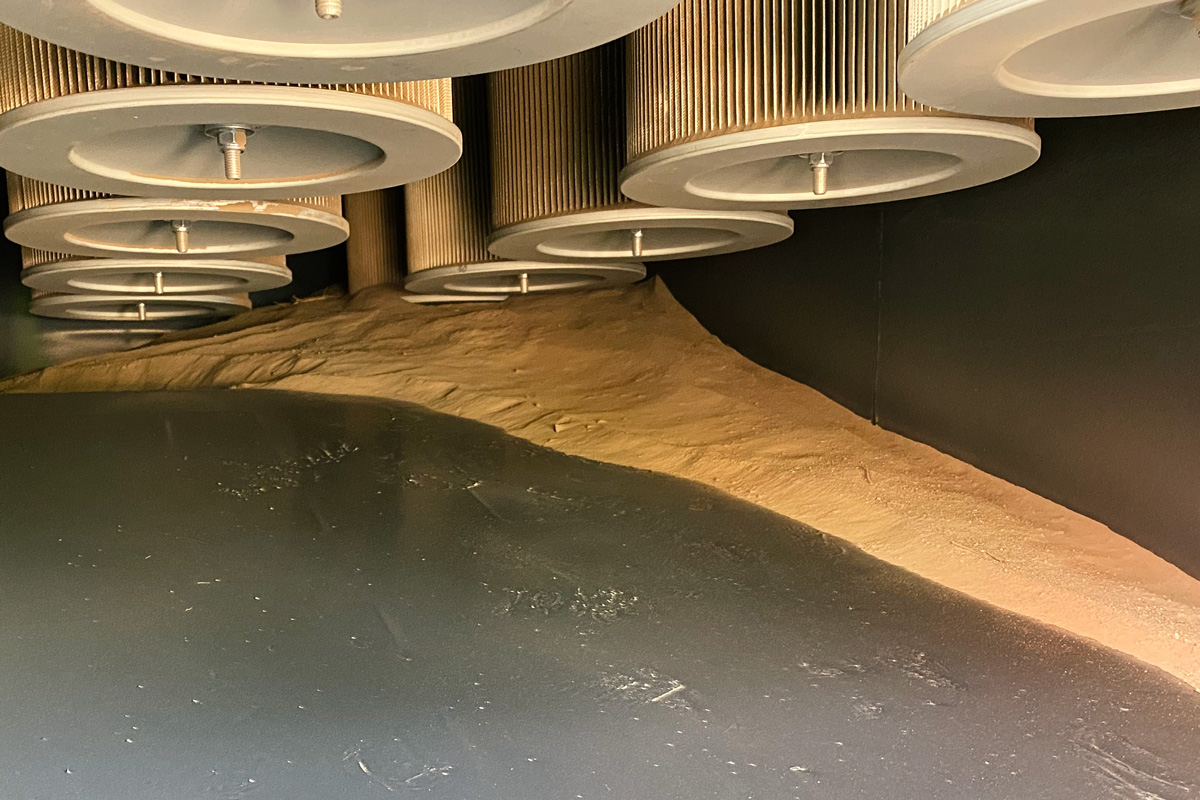 Most of the load ends up in the material chamber. Dust and finer particles are passed on to the filter chamber, which can be emptied separately.